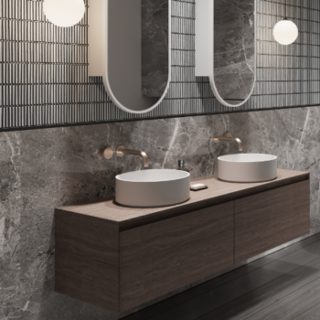 Manufactured from a solid surface, they have a smooth matt finish that is exceptionally hard-wearing and durable. The above counter Père basins are available with Softskin colour options giving the basins a unique two-tone effect.