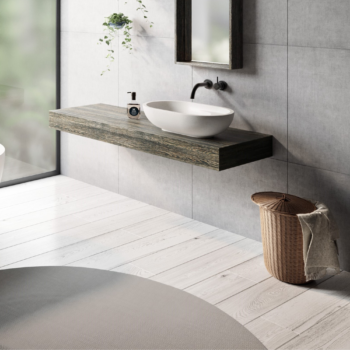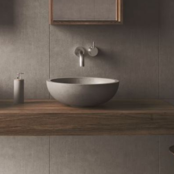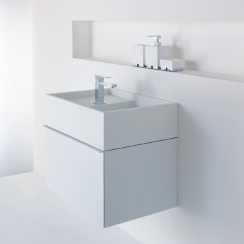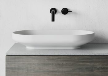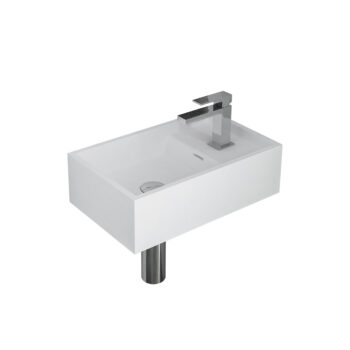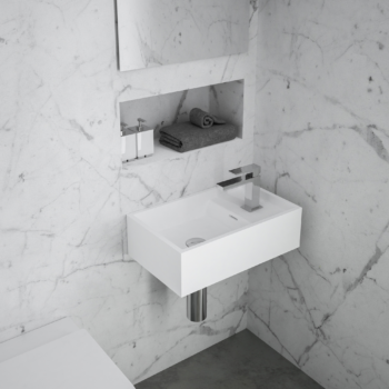 The Villa 600 counter top basin is available in two organic colours, White Haven and Cove Grey. The basin has an offset soap dispenser shelf which can be installed on the left or right hand side. Villa basins are supplied with a pop up waste with matching solid surface plug. Manufactured from solid surface with subtle variations in tone, Villa is hand finished and features a smooth matt surface.